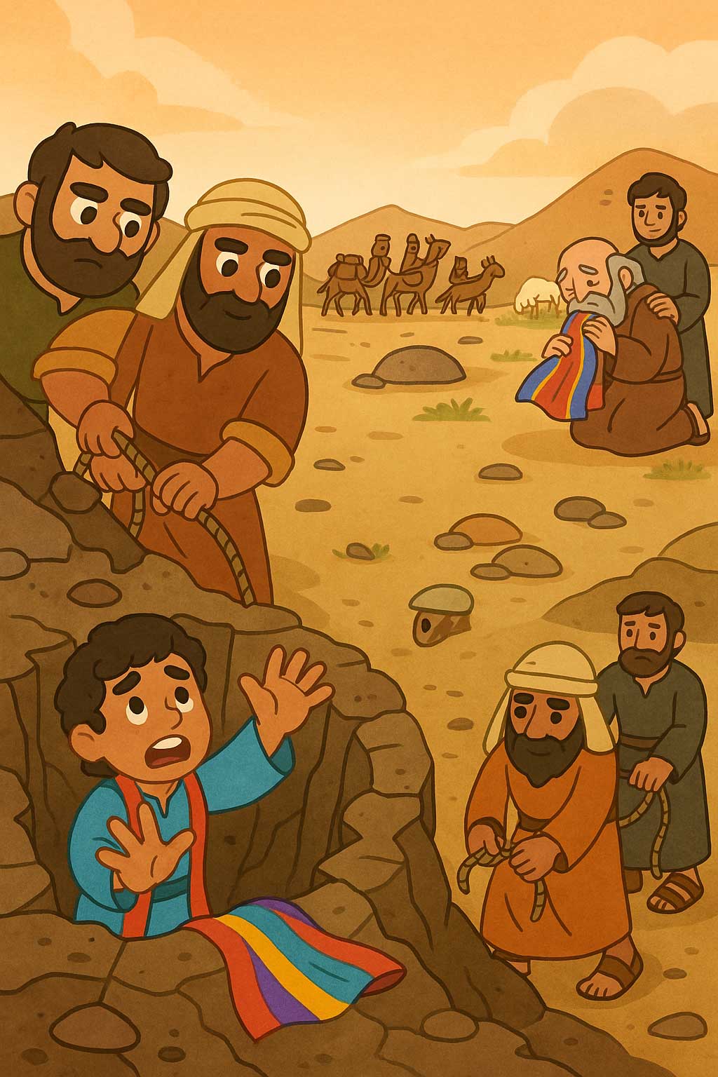 어느 날 형들은 요셉을 구덩이에 던지고 나중에 이집트로 가는 상인들에게 팔았습니다. 그들은 아버지 야곱에게 들짐승에게 잡혀갔다고 말했습니다.
